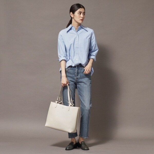 ふんわりとしたフォルムとさりげないハンドルディティールが、女性らしく優しい印象を与える大きめトートバッグです。