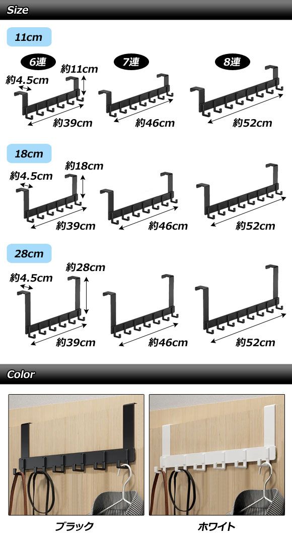 ドアフック 18cm 7連 アルミ製 引っ掛けるだけの簡単設置 選べる2カラー AP-UJ0956-18CM7 カラー: ブラック ホワイト