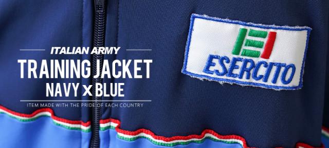 鮮やかなブルーと落ち着いたネイビーカラーによるバイカラーデザインがインパクトのある一枚。フロントの切り替え部分にはイタリアントリコロールのテープを配置し、左胸にはシンプルなイタリア軍のワッペンがアクセントになっています。