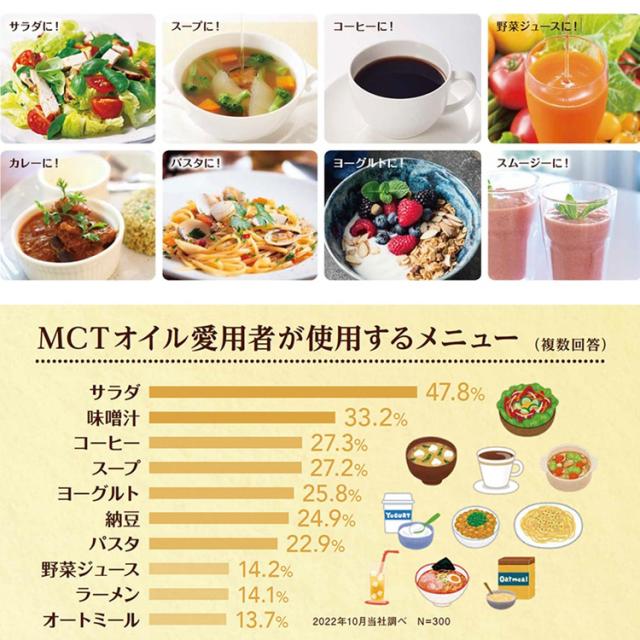 ●日清MCTオイルは、中鎖脂肪酸油100%の食用油です。