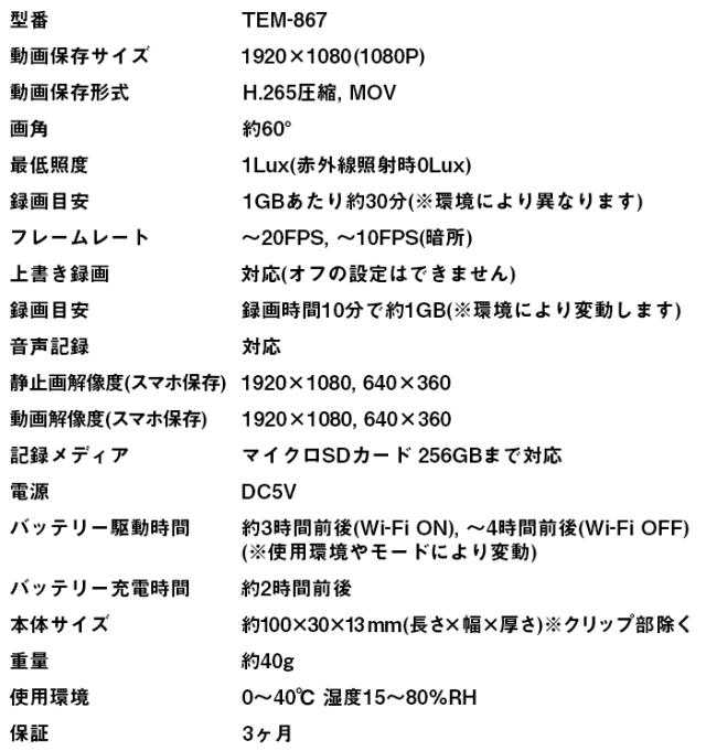 TEM-867は、フルHD(1920×1080)録画に対応し、Wi-Fi機能を搭載したクリップ偽装(擬装)の小型カメラです。
