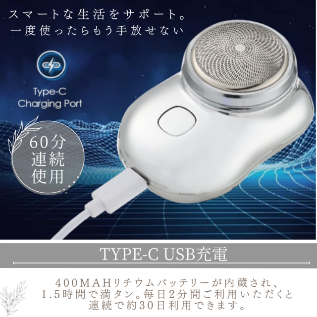 400mAhリチウムバッテリーが内蔵され、1.5時間だけで満タンになる。毎日2分間ご利用いただくと、連続で約30日利用できます。コンパクトな形でも長時間利用可能!