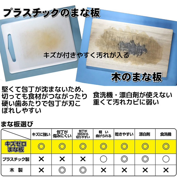 従来のまな板ですと、プラスチック製のまな板は堅くて包丁が沈まないので切っても食材がつながってしまったり、硬い歯あたりで包丁が刃こぼれしやすい。また、木製のまな板はキズが付きやすく汚れが入り、食洗機・漂白剤が使えない、重くて汚れカビに弱いなどの弱点がありましたが、それらをすべてクリアしている商品です。