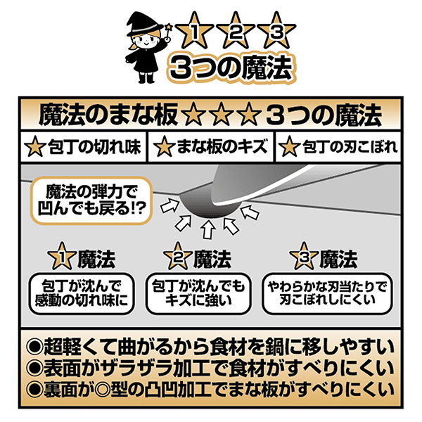 裏面が◎型のでこぼこ加工でまな板がすべりにくくなっています。