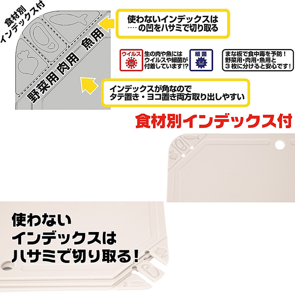 食材別インデックス付き。魚、肉、野菜の3種類。使わないインデックスはハサミで切り取れます。