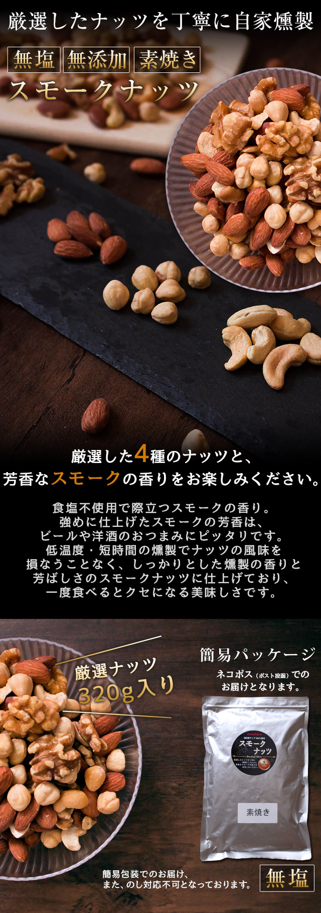 自家燻製 無塩スモークナッツ320g 送料無料 ネコポス(他商品との同梱不可)