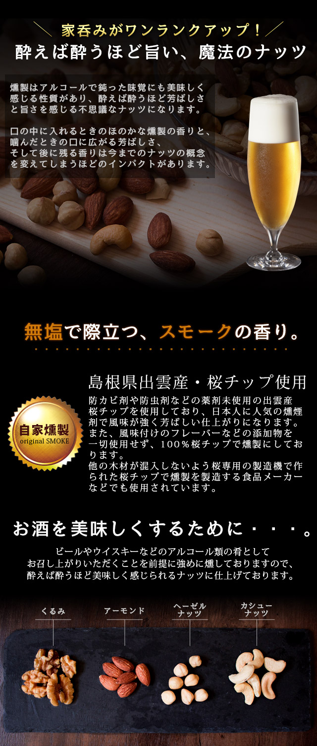 食塩不使用で際立つスモークの香り。強めに仕上げたスモークの芳香は、ビールや洋酒のおつまみにピッタリです。低温度・短時間の燻製でナッツの風味を損なうことなく、しっかりとした燻製の香りと芳ばしさのスモークナッツに仕上げており、一度食べるとクセになる美味しさです。
