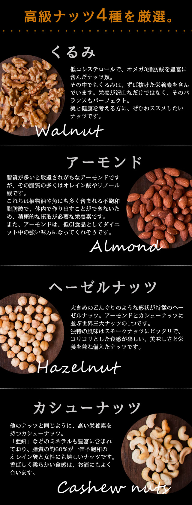 | 原材料名 | アーモンド(アメリカ産)、くるみ、カシューナッツ、ヘーゼルナッツ |