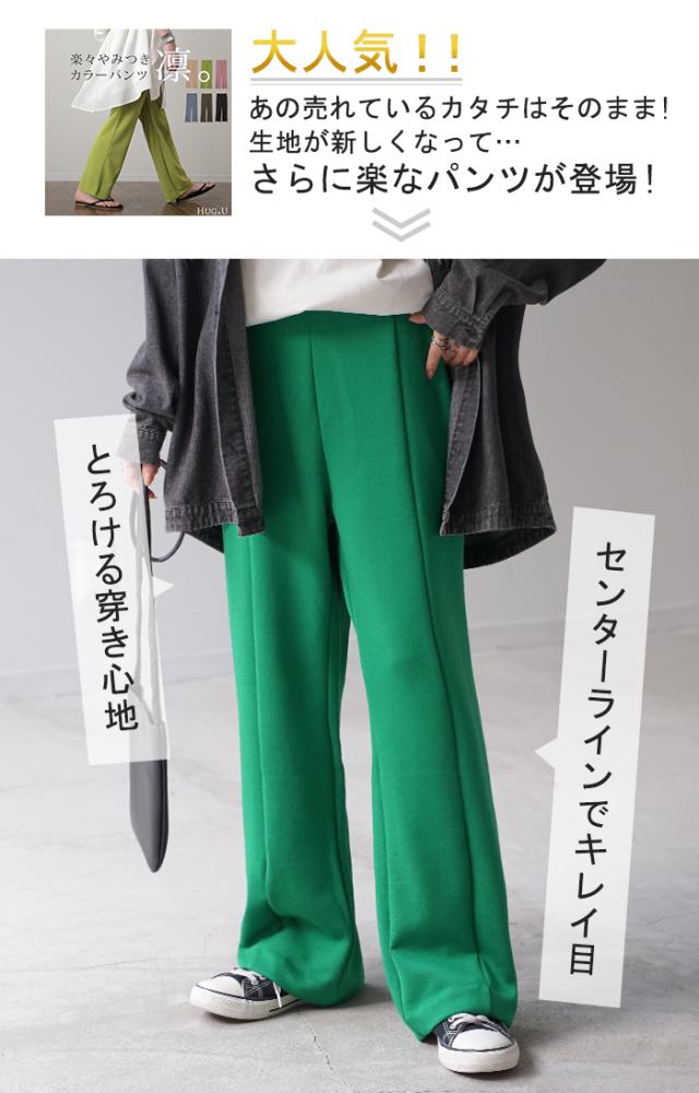 パンツ 超伸び カラーパンツ レディース センターライン 一部12月下旬入荷 スラックス ワイドパンツ ロング ジャージー 大きいサイズ ボトム 体型カバー ボトムス フレアパンツ ずぼん ズボン ハイウエスト グリーン ピンク ブルー ゴム 春 夏 緑 黒 きれいめ HUG.U 秋新作