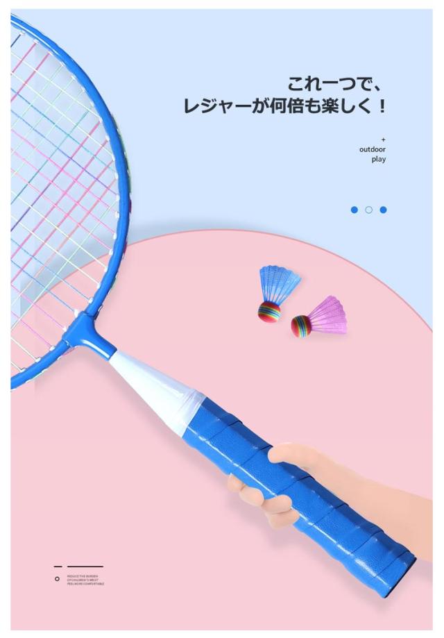 | サイズについての説明 | 6点セット内容:バドミントンラケット*2、ボール*3、収納バッグ*1 サイズ:44*22.5cm 対象年齢3-6歳(適応身長130cm以内) ※実寸はメジャー採寸の為、若干の誤差が生じる場合があります。 ※本製品はレジャー用です。本格的に使用されるかたはご使用になれません。 |