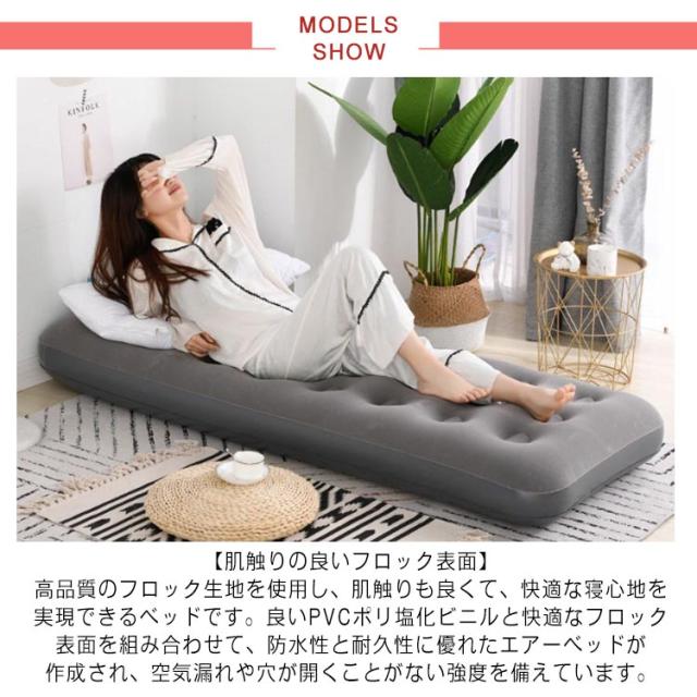 | 【肌触りの良いフロック表面】高品質のフロック生地を使用し、肌触りも良くて、快適な寝心地を実現できるベッドです。良いPVCポリ塩化ビニルと快適なフロック表面を組み合わせて、防水性と耐久性に優れたエアーベッドが作成され、空気漏れや穴が開くことがない強度を備えています。 【人間工学に基づいた内部構造・安定性高い】体を支える人間工学デザインで、体圧分散により、良い睡眠姿勢を促進し、脊椎へのストレスを最大限度に軽減されます。適度な硬さも血液循環に優れ、関節のストレスを緩和させ、筋肉痛やその他の症状を緩和させ、体を全体的にリラックスさせ、質の高い睡眠を実現します。 【超コンパクトに収納性に優れ】長さ188x幅92x厚さ20cmのシングルサイズので、急な来客の時にも、ベッドのような快適な睡眠を過ごせます。使わない時にコンパクトに折り畳んで収納できます。別部屋への移動や引越しなども簡単です! 【多用途】自宅用、急に来客用、キャンプなどはもちろん、旅行用、防災、地震対策などの非常時用にも適用です。軽くて、移動あるいは持ち運びも便利です。 | |