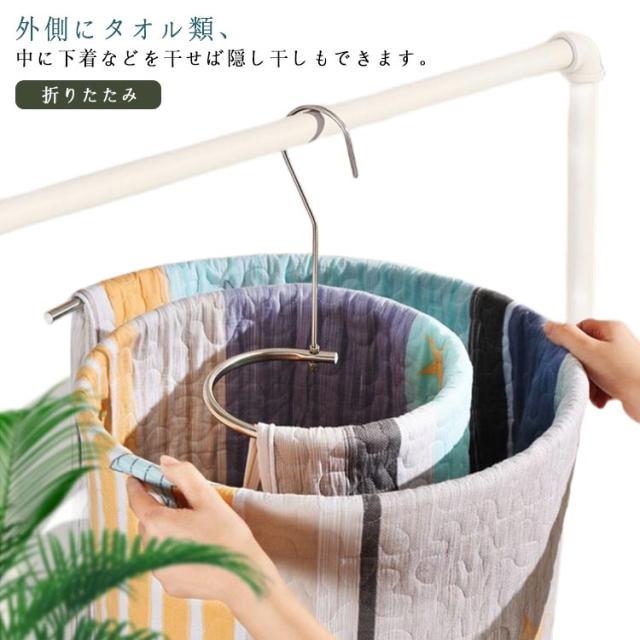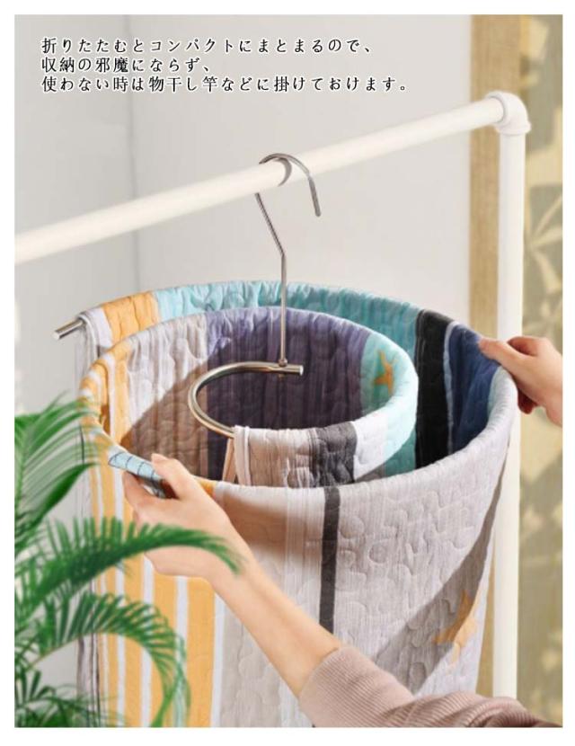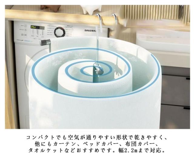 | 省スペースで干せるてぐるぐる通すだけで毛布やシーツ、バスタオルを省スペースで干してしっかり乾かせる便利なハンガー! コンパクトでも空気が通りやすい形状で乾きやすく、他にもカーテン、ベッドカバー、布団カバー、タオルケットなどおすすめです。幅2.2mまで対応。 隠し干しにも使えます。外側にタオル類、中に下着などを干せば隠し干しもできます。 折りたたむとコンパクトにまとまるので、収納の邪魔にならず、使わない時は物干し竿などに掛けておけます。 | |