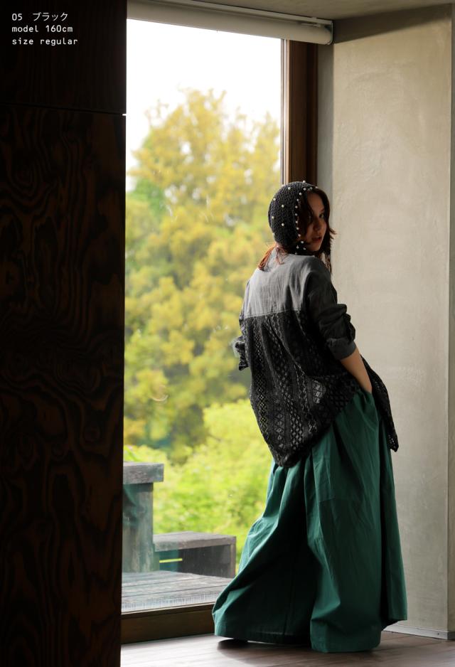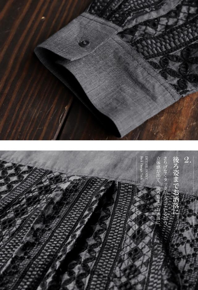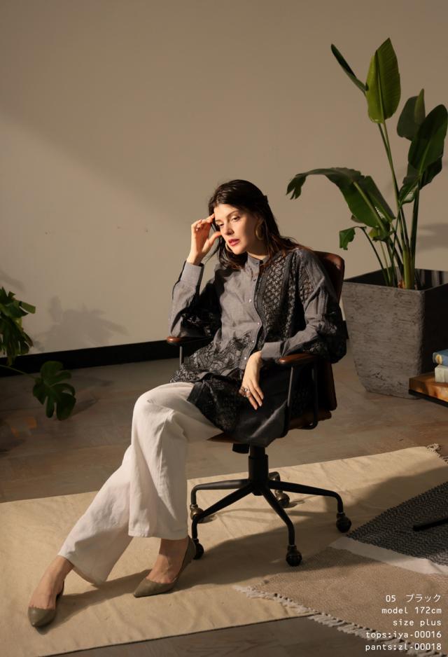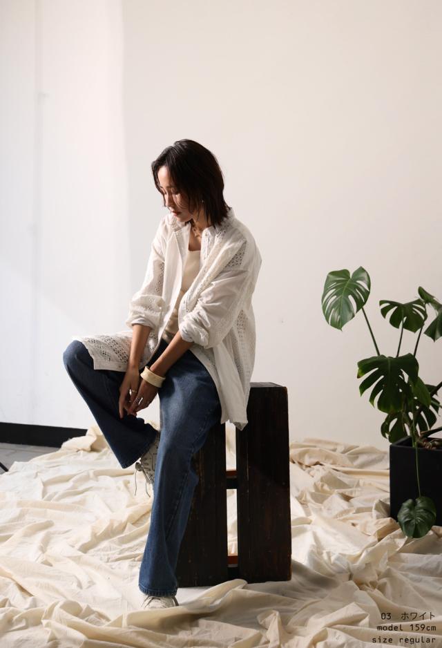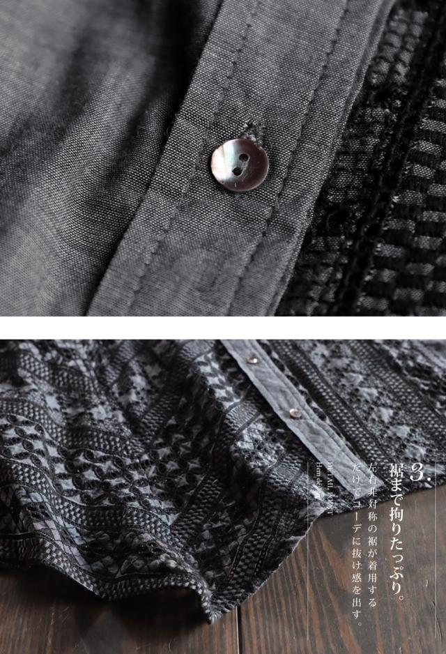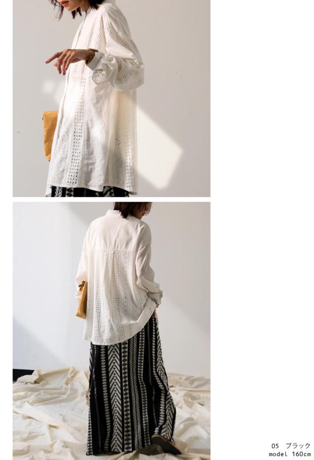 iya-00016 長袖 綿 スタンドネック 透け スケルトン レース シアー 刺繍 前開き シェルボタン アシメ レイヤード ゆったり サイズ展開 ナチュラル デザインシャツ 大きめ ブラウス