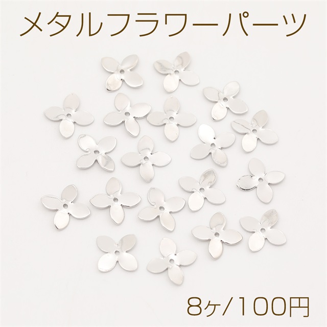 メタルフラワーパーツ ビーズキャップ 花座 座金 四弁花 中心通し穴あり ロジウム 8×11mm(8ヶ)