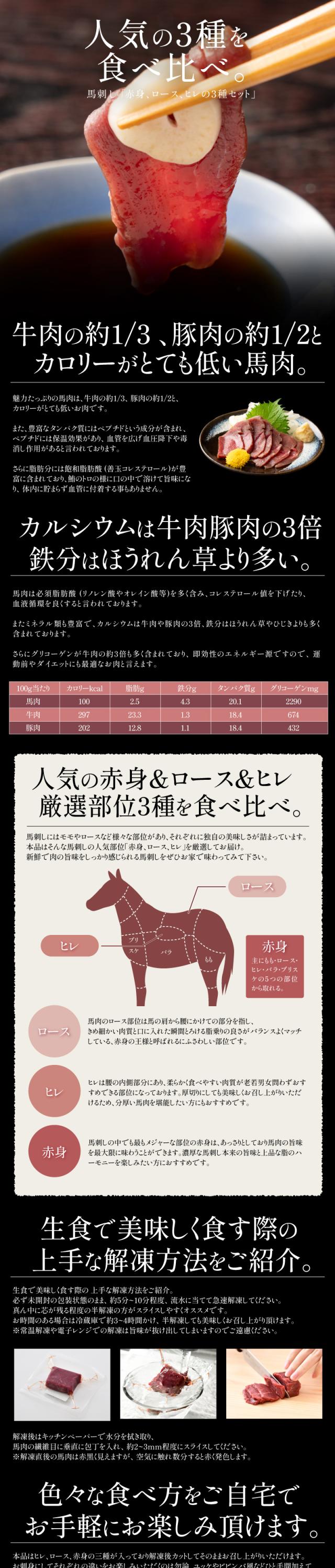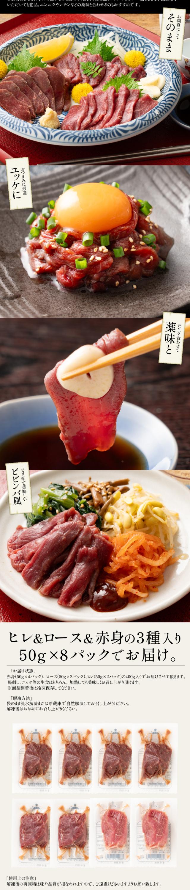 馬刺し 赤身 ロース ヒレ 3種 食べ比べ セット 400g 肉 馬肉 詰め合わせ 馬刺 霜降り 3人前 4人前 馬ヒレ おつまみ お肉 贈り物 記念日 ギフト プレゼント お歳暮