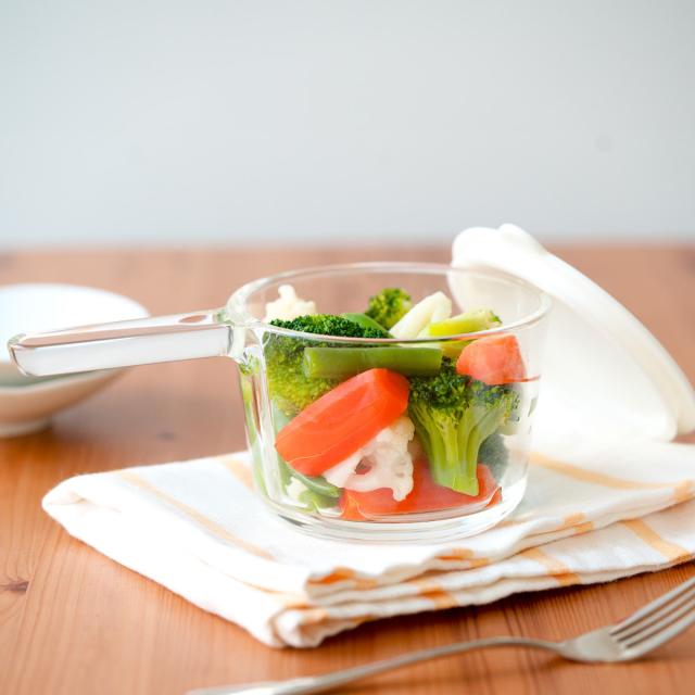 フタを外せば、電子レンジもオーブンも使えるおしゃれなガラスの小鍋です。調理してそのまま食卓に出せるので、お皿に移し替える手間がかかりません。熱々の料理をお召し上がりいただけます。