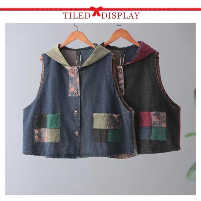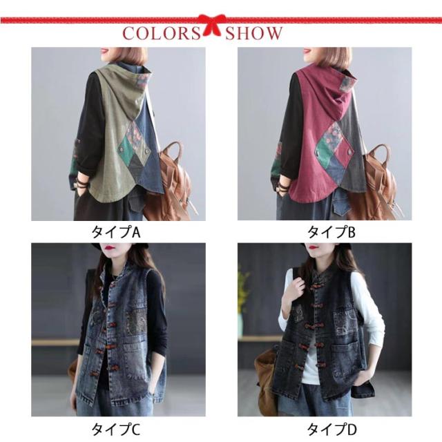 ベスト 秋 レディース トレンチコート チャイナ風 デニム 中国風 ジレ 冬 前開き 秋 ジーンズベスト 服 トップス 春 デニムアウター 中華風 ベストジレ 羽織り はおり アウター ノースリーブ ゆったり フード付き ベスト 重ね着 体型カバー カジュアル