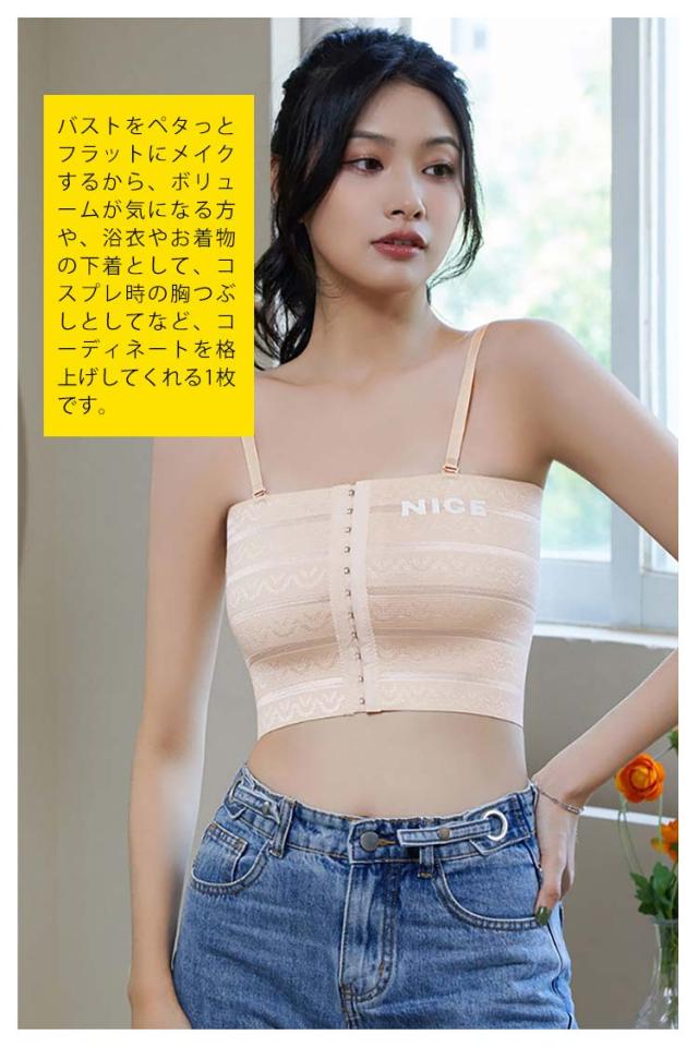 | 男装コスプレや浴衣や和装にも、バストを平らにしてくれる胸つぶしインナー。 長時間着用でも苦しくない!通気性に優れた素材を使用。 胸をしっかりと覆ってスッキリ収納してくれます。 フロントホック仕様ので使い勝手が良いです。 同じ色/透明肩紐選べる! バストをペタっとフラットにメイクするから、ボリュームが気になる方や、浴衣やお着物の下着として、コスプレ時の胸つぶしとしてなど、コーディネートを格上げしてくれる1枚です。 | |