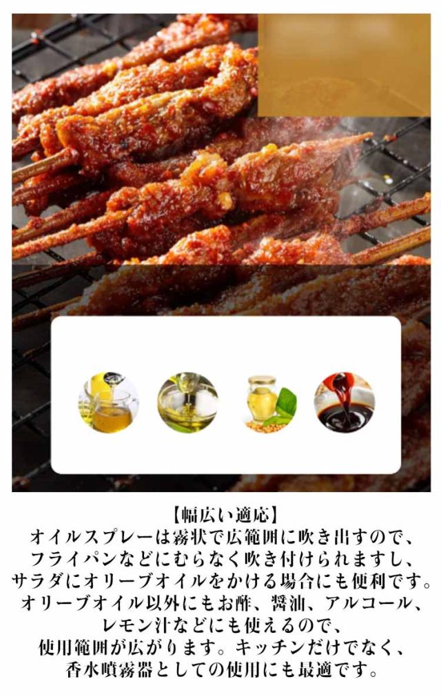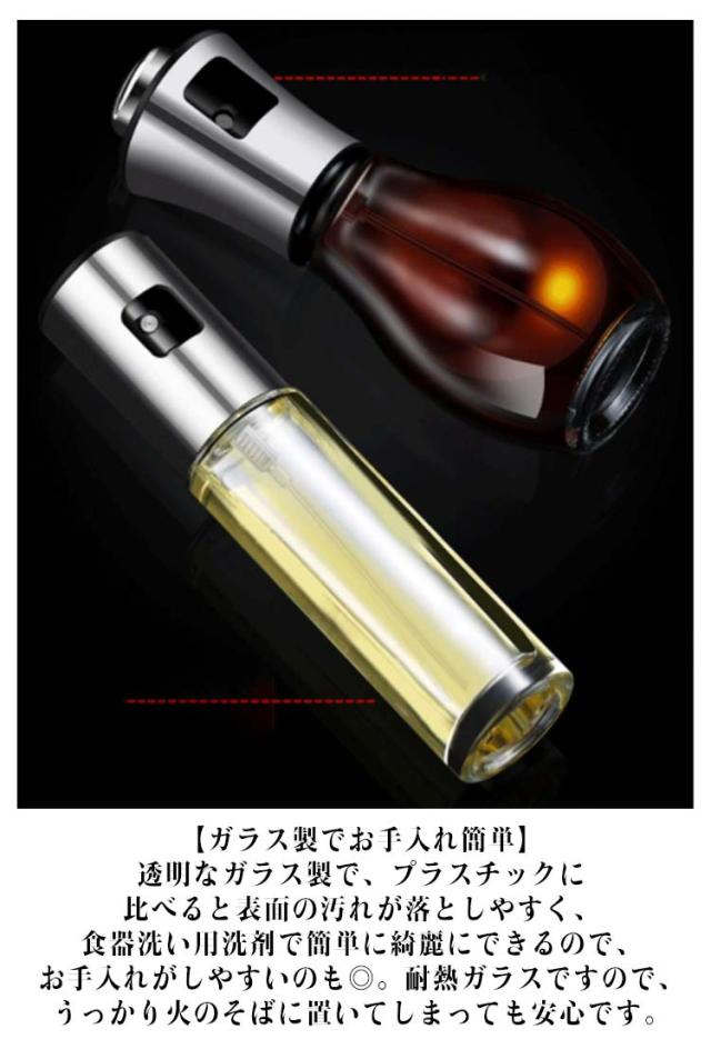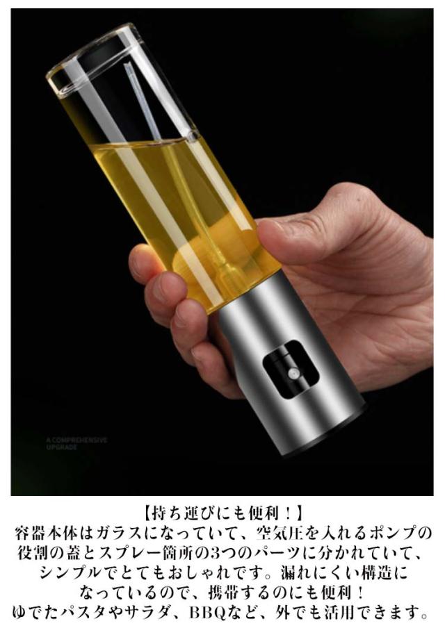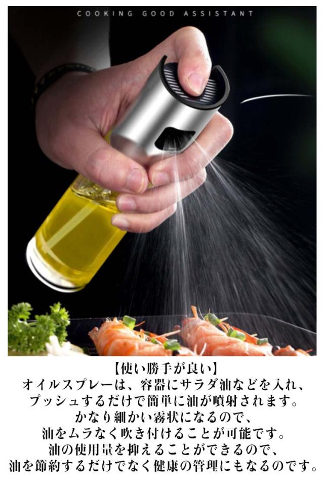 | 【使い勝手が良い】オイルスプレーは、容器にサラダ油などを入れ、プッシュするだけで簡単に油が噴射されます。かなり細かい霧状になるので、油をムラなく吹き付けることが可能です。油の使用量を抑えることができるので、油を節約するだけでなく健康の管理にもなるのです。 【幅広い適応】オイルスプレーは霧状で広範囲に吹き出すので、フライパンなどにむらなく吹き付けられますし、サラダにオリーブオイルをかける場合にも便利です。オリーブオイル以外にもお酢、醤油、アルコール、レモン汁などにも使えるので、使用範囲が広がります。キッチンだけでなく、香水噴霧器としての使用にも最適です。 【ガラス製でお手入れ簡単】透明なガラス製で、プラスチックに比べると表面の汚れが落としやすく、食器洗い用洗剤で簡単に綺麗にできるので、お手入れがしやすいのも◎。耐熱ガラスですので、うっかり火のそばに置いてしまっても安心です。 【持ち運びにも便利!】容器本体はガラスになっていて、空気圧を入れるポンプの役割の蓋とスプレー箇所の3つのパーツに分かれていて、シンプルでとてもおしゃれです。漏れにくい構造になっているので、携帯するのにも便利!ゆでたパスタやサラダ、BBQなど、外でも活用できます。 | |