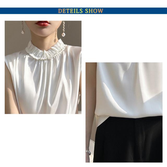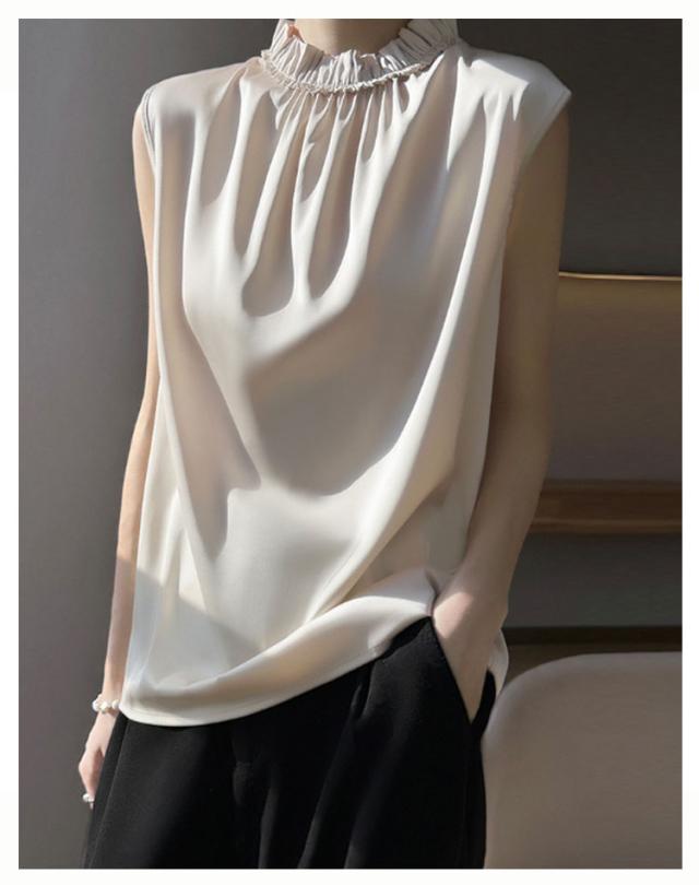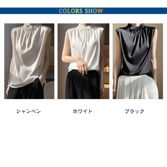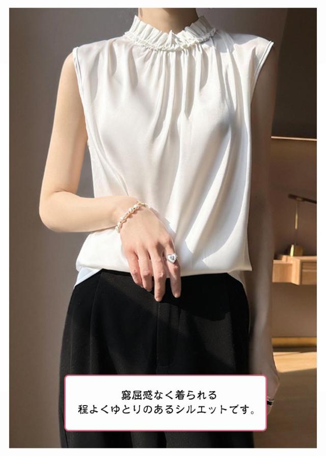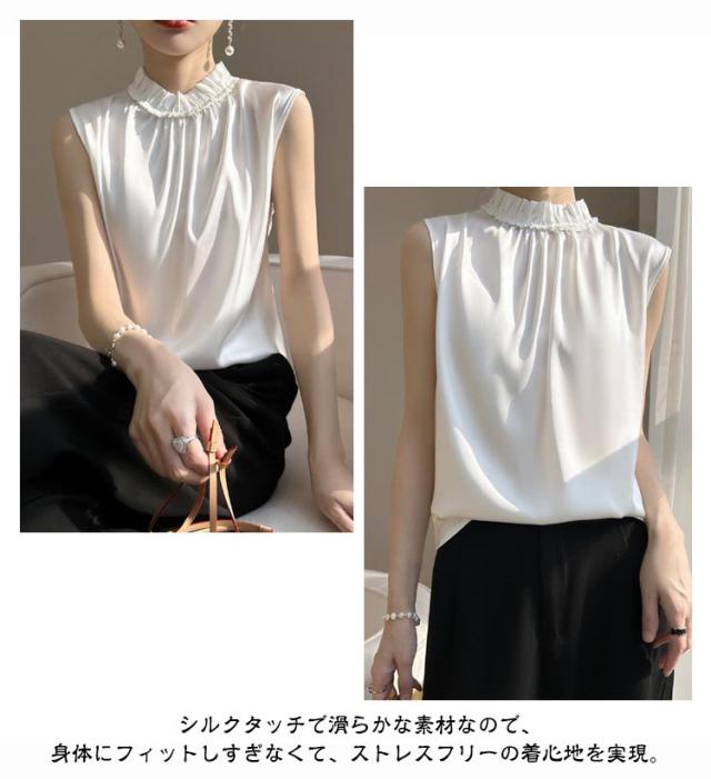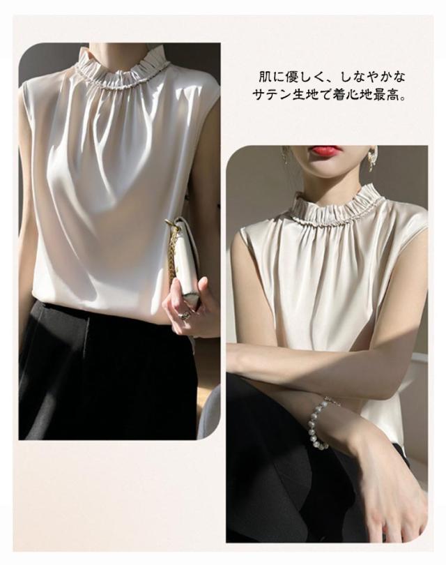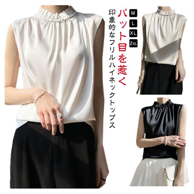 エレガント オフィス tシャツ トップス フレンチスリーブ サテン フリル 可愛い 大きサイズ ハイネックブラウス キレイめ 光沢感 サテンtシャツ 通勤 サテン ノースリーブ 大人 女性 30代 40代 OL 大人 女性 無地 重ね着