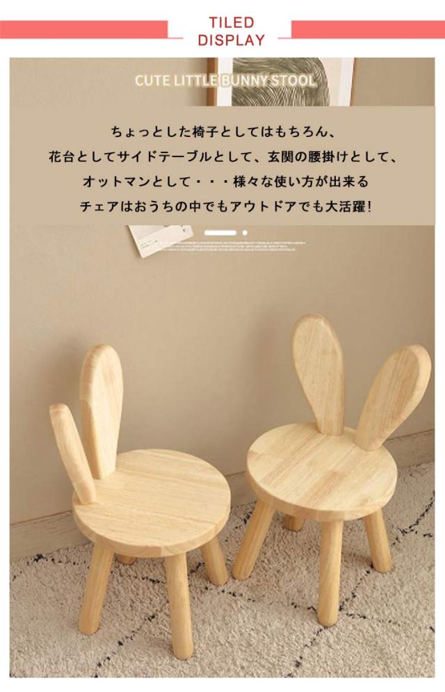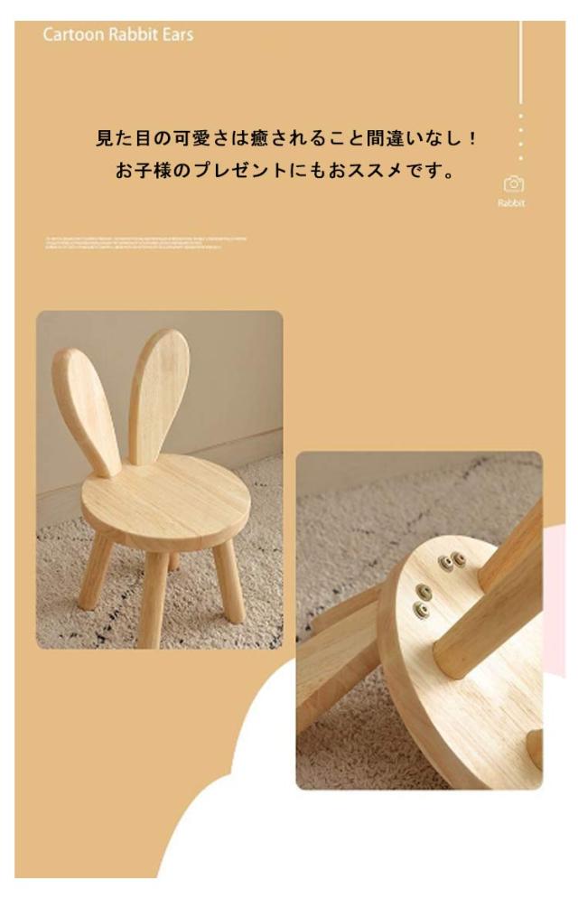 | うさぎの耳が付いた可愛くて癒されるチェア。 自然の柔らかさ、温もりを感じる天然木製。 ちょっとした椅子としてはもちろん、花台としてサイドテーブルとして、玄関の腰掛けとして、オットマンとして・・・様々な使い方が出来るチェアはおうちの中でもアウトドアでも大活躍! 見た目の可愛さは癒されること間違いなし!お子様のプレゼントにもおススメです。 | |