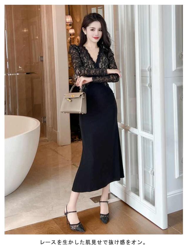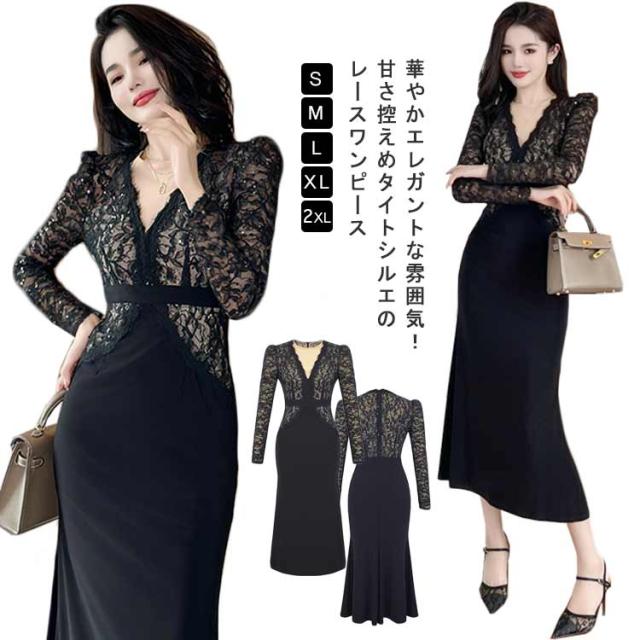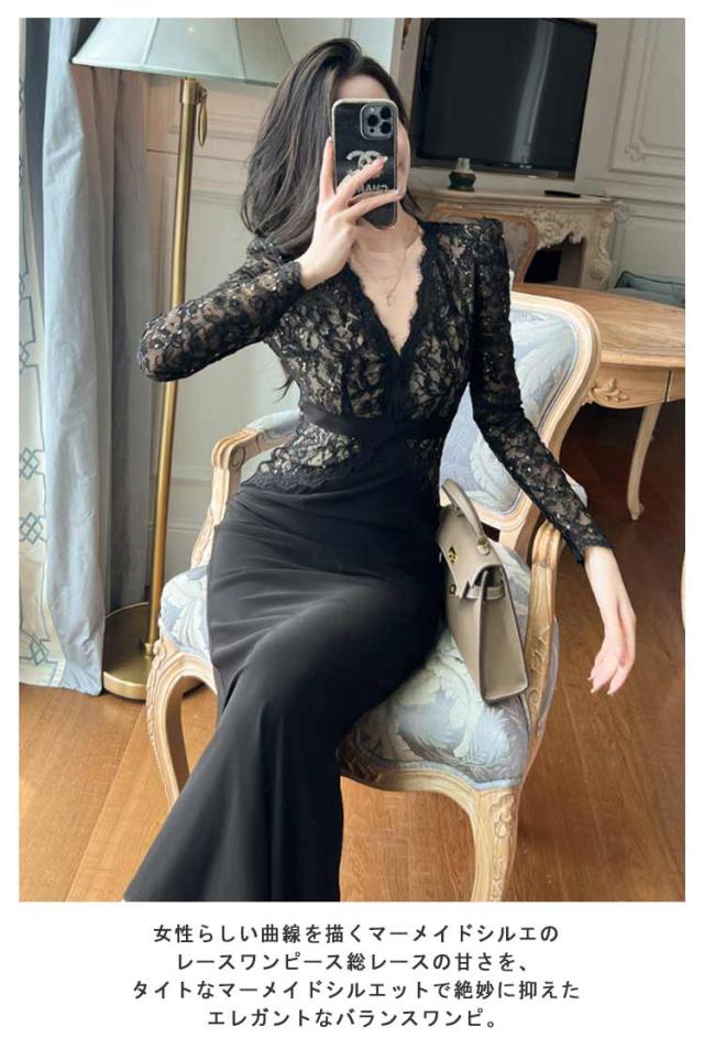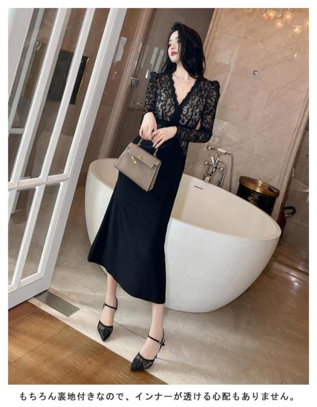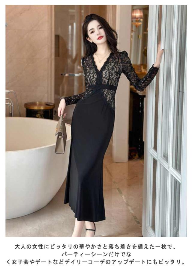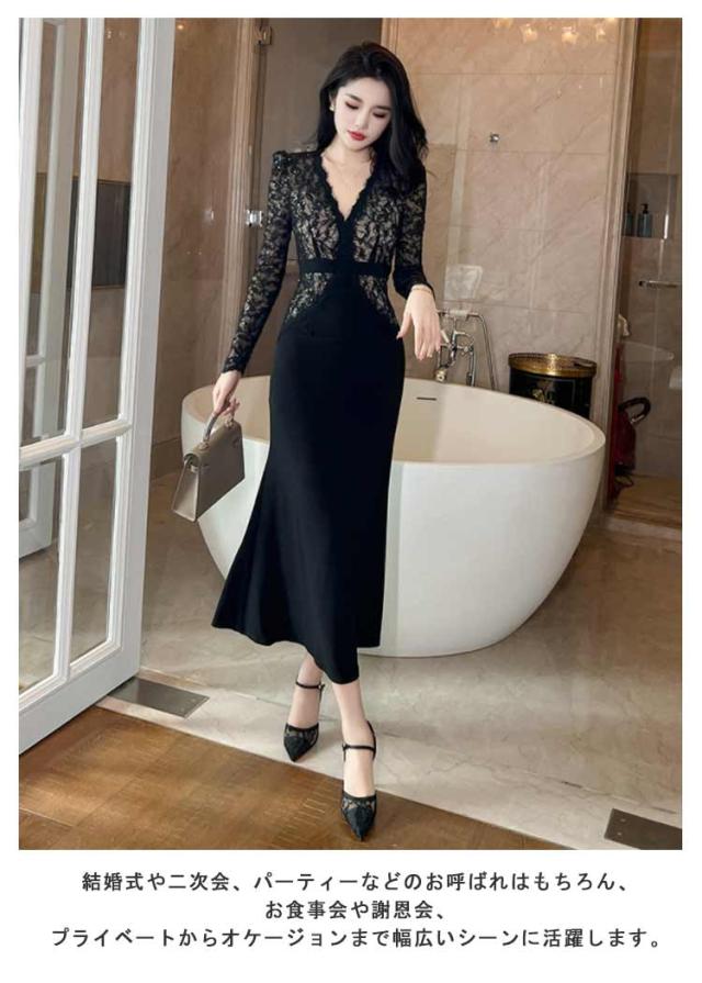 パーティードレス ブラックドレス 黒ワンピ タイトワンピ マーメイド ワンピース シースルー レース 透け感 黒 タイト ワンピース 長袖 ロング丈 きれいめ タイトワンピース 成人式 卒業式 謝恩会 二次会 お呼ばれ レディース オケージョン