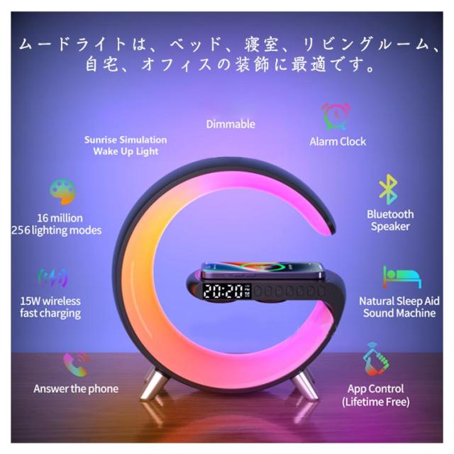 | ● 一台4用!LEDライトかつスピーカー機能であり、さらにワイヤレス充電器にてLED本体とその他の端末を同時に充電することが可能となります。 ●ワイヤレス充電最大15W急速充電対応可能!ライトベースの上に置くだけでスマホを充電できます。 ●仕事、勉強、読書、睡眠中にこの素晴らしいライトを使用できます。尚、音楽をライトと連動させることもできます。 ●電球ボタンをクリックして、10 種類のライトカラーモードを切り替えます。他の 256 のモードと 1600 万の光の色は、APP を介して調整できます。 ●スヌーズ目覚まし時計は穏やかで平和な音で、体が徐々に目覚めるのを助けます。 ●ムードライトは、ベッド、寝室、リビングルーム、自宅、オフィスの装飾に最適です。誕生日、クリスマス、新年、感謝祭などの理想的なギフトです。 | |