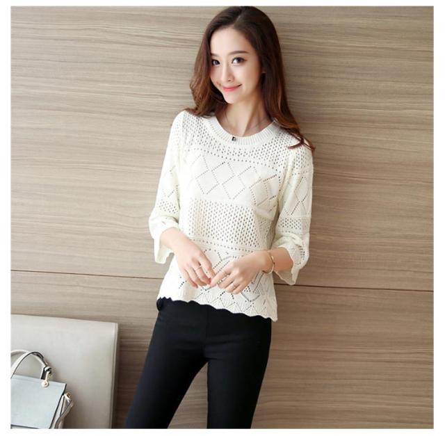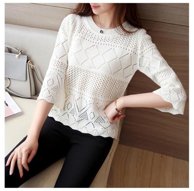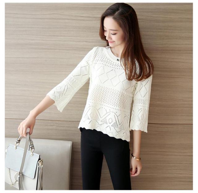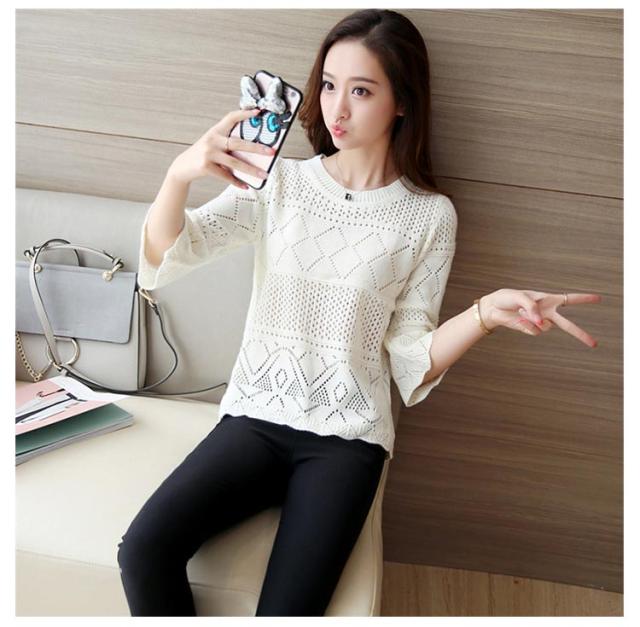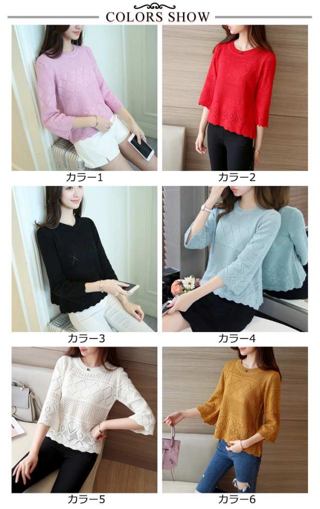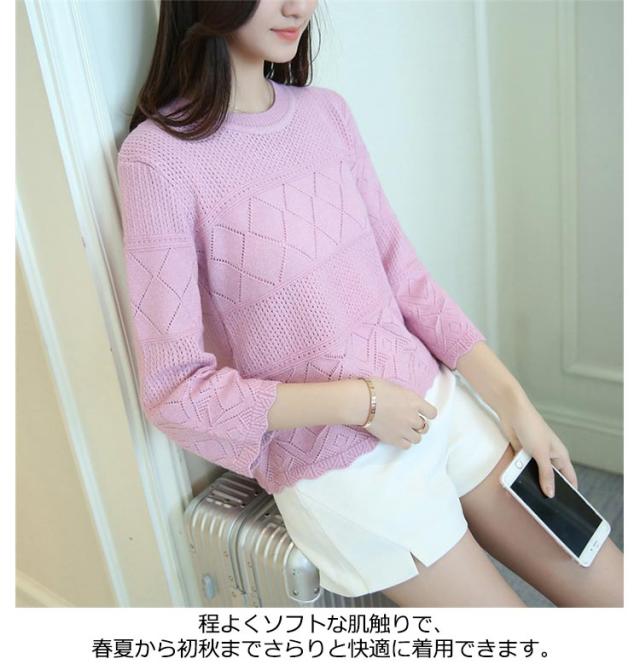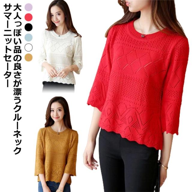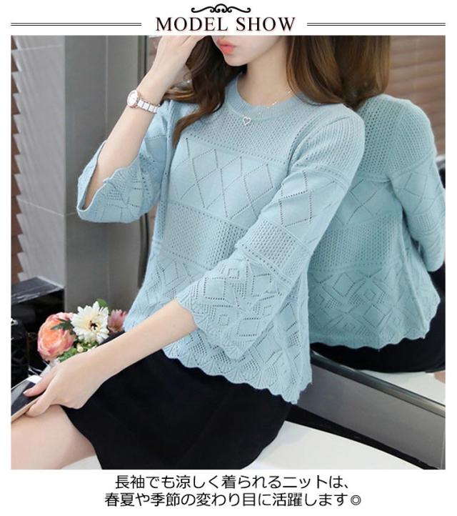 送料無料 ニット カットソー 透かし編み 七分袖 クルーネック フレア ト ップス レディース サマーニット セーター 春夏 かぎ編み ルーズ おしゃれ シンプル オフィス カジュアル 重ね着 レイヤード トレンド フリーサイズ