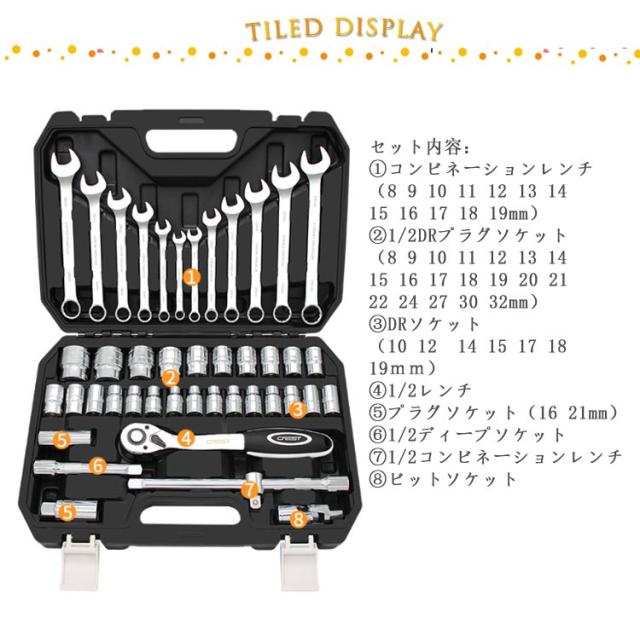 | サイズについての説明 | サイズ:380*280*83mm セット内容:1.コンビネーションレンチ(8 9 10 11 12 13 14 15 16 17 18 19mm)2.1/2DRプラグソケット(8 9 10 11 12 13 14 15 16 17 18 19 20 21 22 24 27 30 32mm)3.DRソケット(10 12 14 15 17 18 19mm)4.1/2レンチ5.プラグソケット(16 21mm)6.1/2ディープソケット7.1/2コンビネーションレンチ8.ビットソケット |