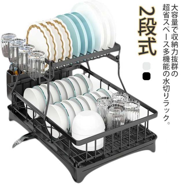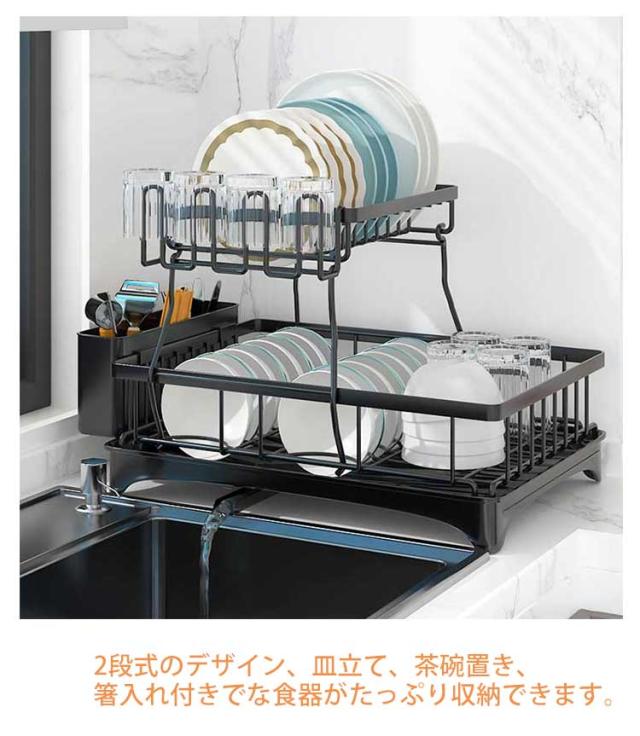 水切りラック 2段式 水切りかご 水切りバスケット キッチン収納 水が自動で流れる 乾燥 食器水切り キッチン収納 大容量 食器乾燥 皿立て 皿ラック コップ収納 箸収納 包丁スタンド おしゃれ 食器置き 台所用品ホルダー