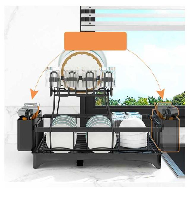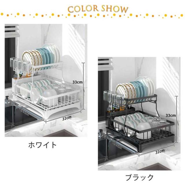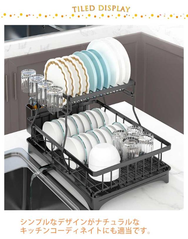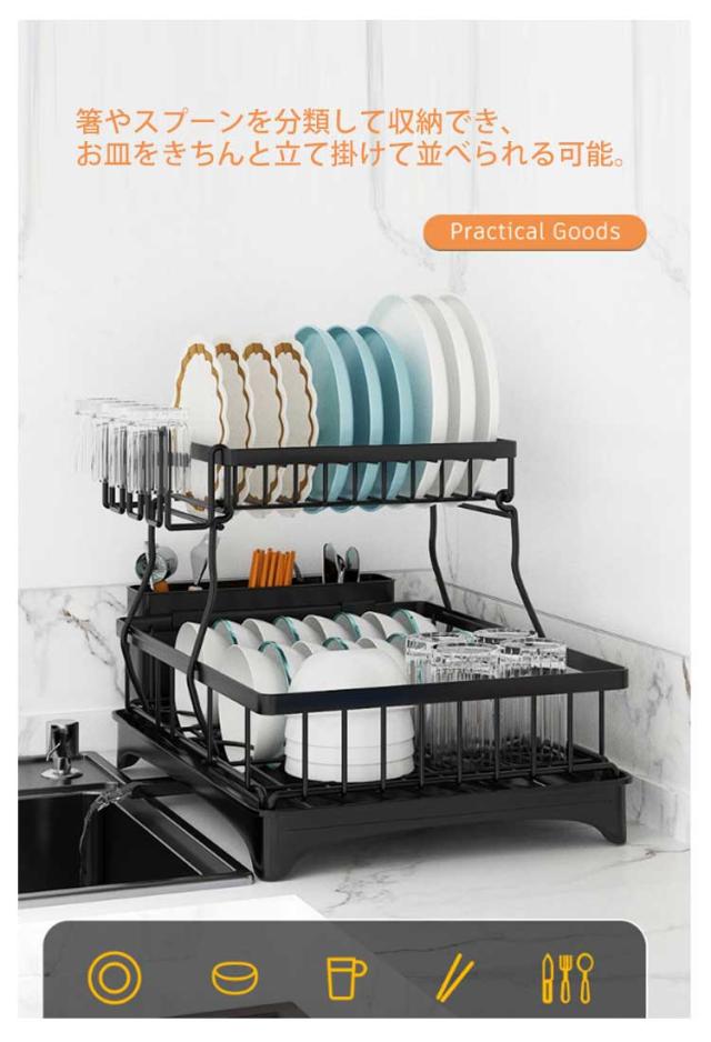 | 大容量で収納力抜群の超省スペース多機能の水切りラック。 シンプルなデザインがナチュラルなキッチンコーディネイトにも適当です。 2段式のデザイン、皿立て、茶碗置き、箸入れ付きでな食器がたっぷり収納できます。 水受けトレー付け、テーブルに水が溜まる心配はありません。 箸やスプーンを分類して収納でき、お皿をきちんと立て掛けて並べられる可能。 | |