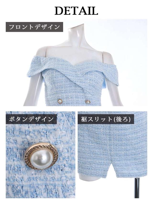 ☆ブラック・ピンク・ブルーのツイードドレスは大人かわいい印象を与えるオフショルドレス。