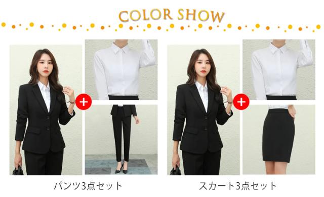 | 上品でスタイリッシュなスーツの3点セット! ジャケット+シャツ+スカート/パンツの3点セットです。 細魅せ効果絶大、スリムラインが美シルエットをメイク! ビジネスシーンから、パーティー、フォーマルまでいろいろなシーンで活躍すること間違いなし。 | |