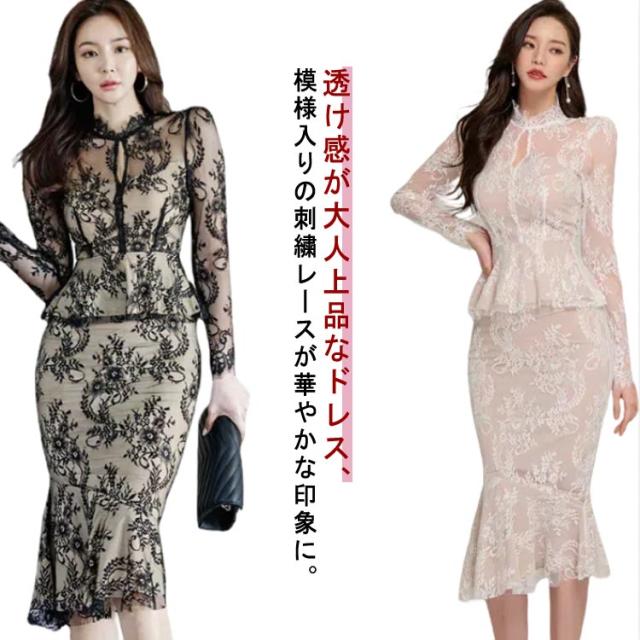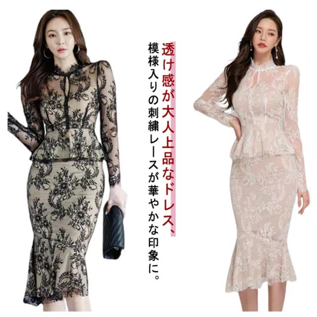パーティードレス 上品 刺繍 レース レディース タイトスカート マーメイド ドレス フォーマル OL オフィスカジュアル 通勤 お呼ばれ 結婚式 二次会 きれいめ 春 春秋 長袖 オケージョン ママ 母 卒業式 入学式 入園式 卒園式 発表会 黒ワンピース