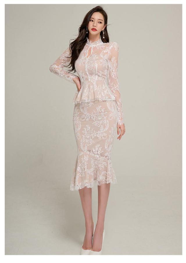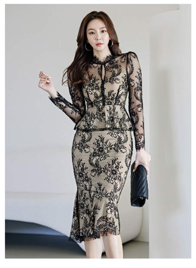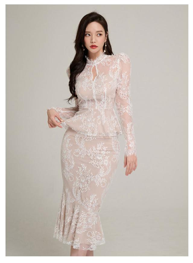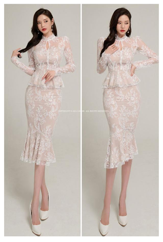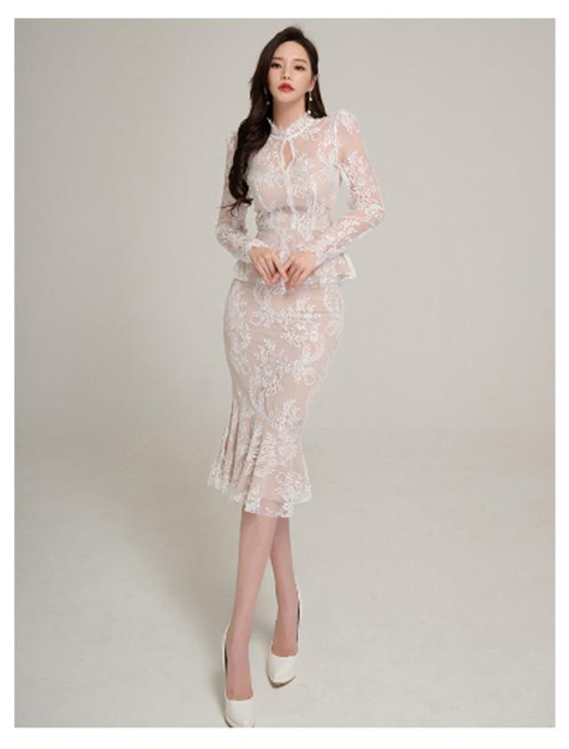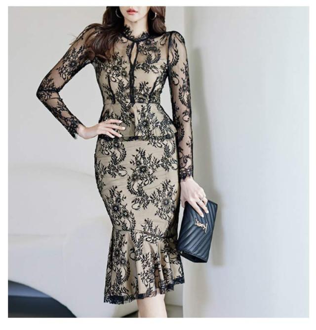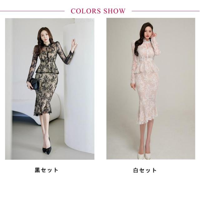 | 透け感が大人上品なドレス、模様入りの刺繍レースが華やかな印象に。 レーストップスとマーメイドスカートセットです。華やかエレガントな雰囲気のアイテム。 ボディラインにフィットする美シルエット。 上品で華やかなレースワンピースは、結婚式や二次会、謝恩会などのパーティーシーンにピッタリです。 | |