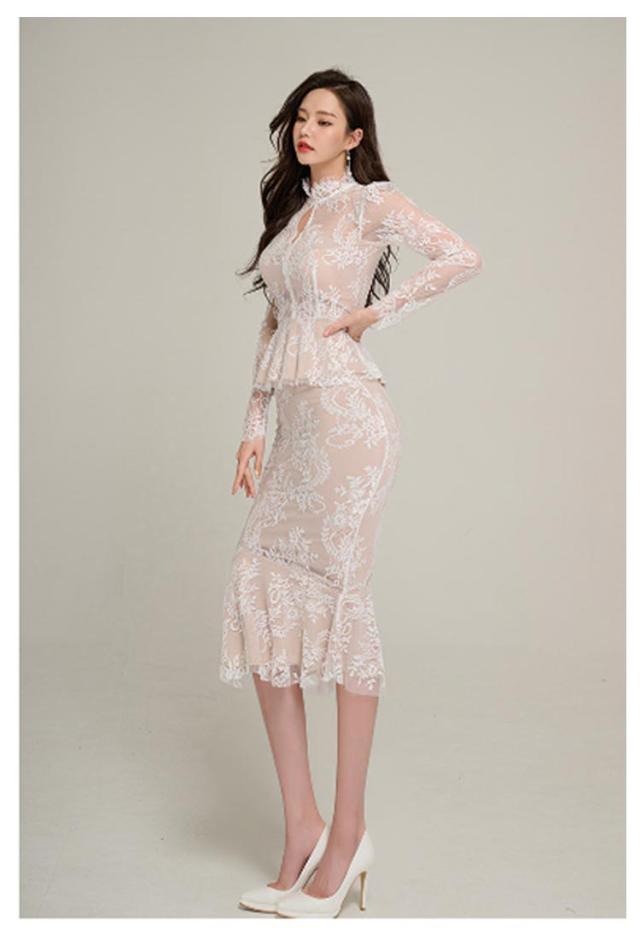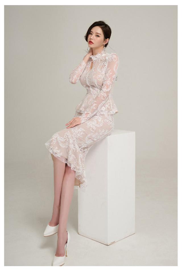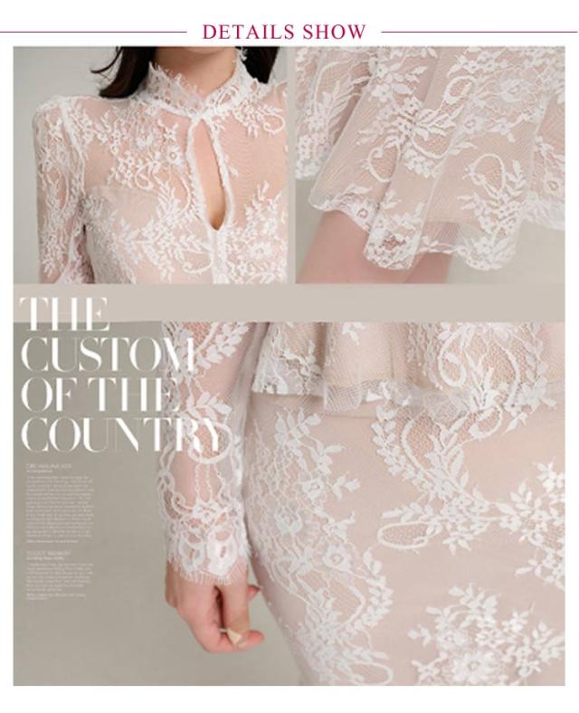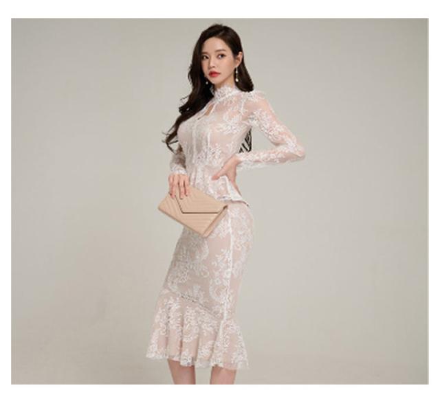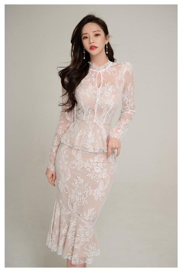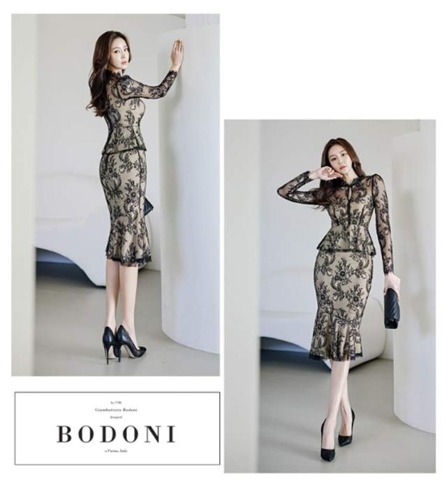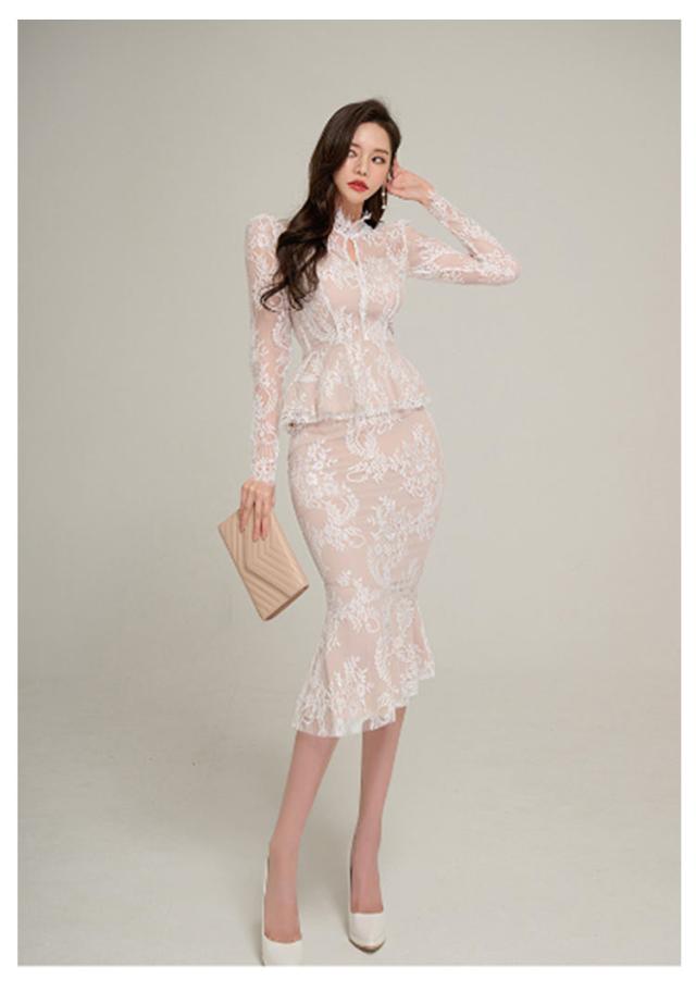 | 透け感が大人上品なドレス、模様入りの刺繍レースが華やかな印象に。 レーストップスとマーメイドスカートセットです。華やかエレガントな雰囲気のアイテム。 ボディラインにフィットする美シルエット。 上品で華やかなレースワンピースは、結婚式や二次会、謝恩会などのパーティーシーンにピッタリです。 | |