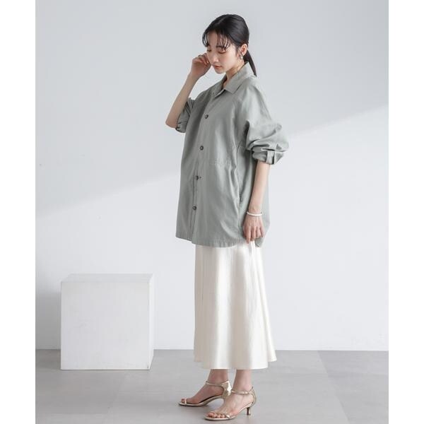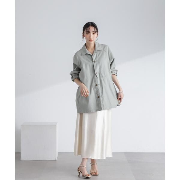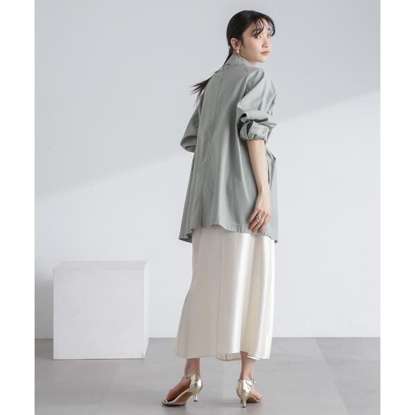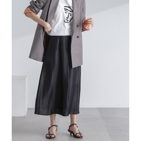 トレンド感あるシャイニー素材を品良く合わせられるロングスカート。裾にかけて絶妙に広がるシルエットが女性らしく、程よい肉感で身体のラインをひろいにくいのも魅力的。ロゴT+ジャケットで外した着こなしや、オーバーシャツを合わせて裾を見せるコーディネートも素敵です。