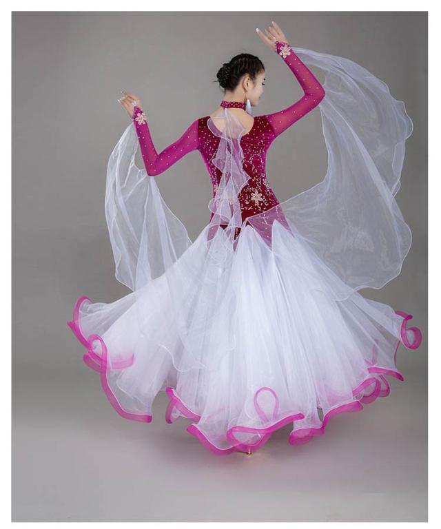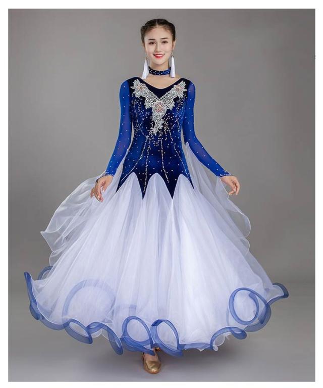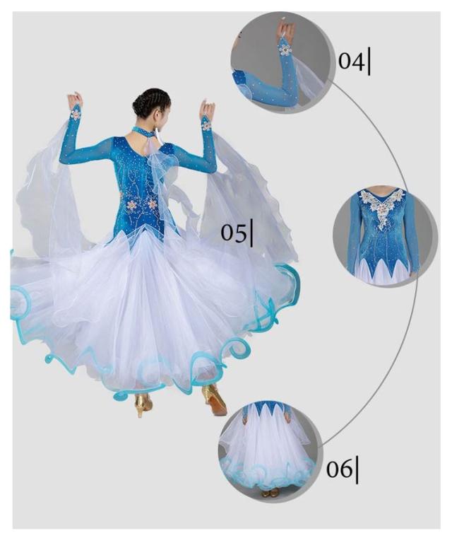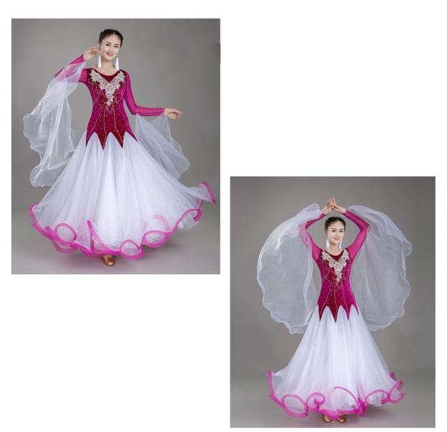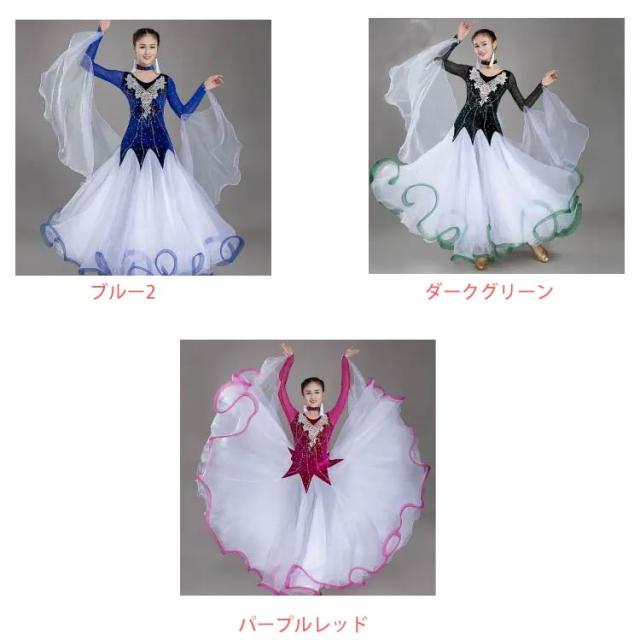 6色 社交ダンス モダンドレス ワルツ タンゴ 社交ダンス衣装 ダンス発表会 大きい裾 社交ダンスドレス 競技用のドレス ゴージャス スタンダードドレス デモ用 ラテン衣装 S~3XL 胸パット付・レオタード式 中指にかけるタイプ スパンコール 花柄 刺繍 ストーン飾り
