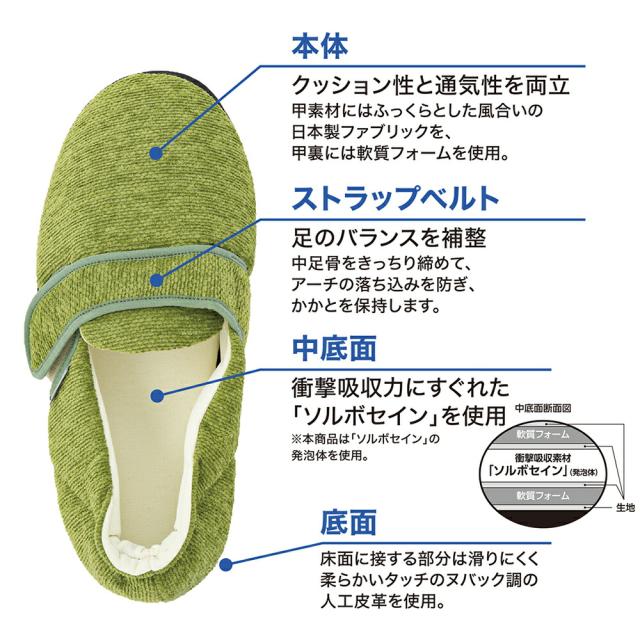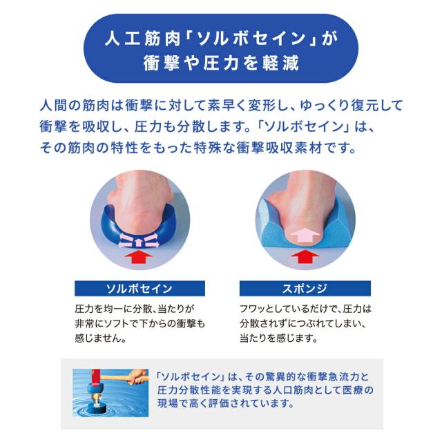 かかと部分には、衝撃吸収・圧力分散性に優れた「ソルボセイン」を使用し、柔らかいながらもしっかりと足裏を保護します。