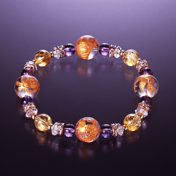 水晶は古代より不思議な霊力がある石と伝えられています。身につけている人を災いから守り、数々の奇跡を起こすといわれています。開運の万能石とも呼ばれています。そして風水において黄色は金運色とされており、金運・財運が授かるといわれています。また紫水晶は浄化や邪気祓いの能力が強く、あらゆる場面で使えるお守りになります。爆裂水晶は稀少で入手の難しい水晶とされ、邪気をはらい、幸運を呼び込む石として古来より珍重されてきました。強大な招運力が宿るとされ、身につけるだけで邪気や悪運を吸い取り、吐き出してくれるといわれています。