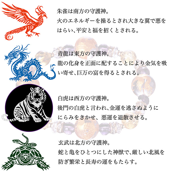 ゴージャス四神獣水晶ブレス‐BL_490 四神獣 青龍 白虎 朱雀 玄武 水晶 白水晶 紫水晶 爆裂黄水晶 ロンデル パワーストーン クリスタルパワー ブレスレット メンズ レディース