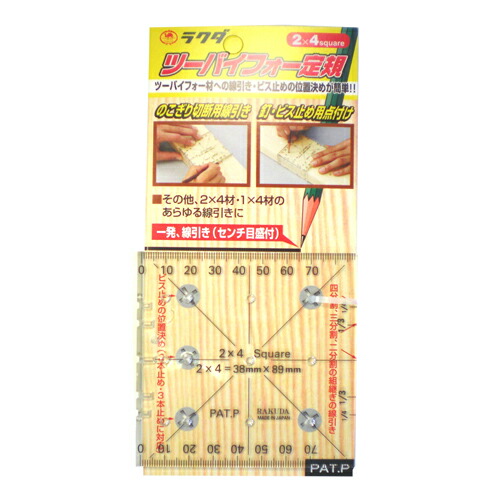 | のこぎり切断用線引き、釘・ビス止め用点付け作業。定規のサイズが2×4材の幅と厚みに合わせてあるので2×4材に最適で、1×4材にも御使用いただけます。のこぎり切断前の直角の線引きが一発で出来ます。接合部の釘またはビス止めの最適な位置決めが一発で出来ます。材料の木口部の1/2、1/3、1/4の線引きが出来ます。のこぎり切断前の45度の線引き、2X4・1X4材の各面の中心線引き、2X4・1X4材の枠組みや棚組みの際の材料位置決め線引き、二分割・三分割・四分割の組継ぎの線引きができます。 |