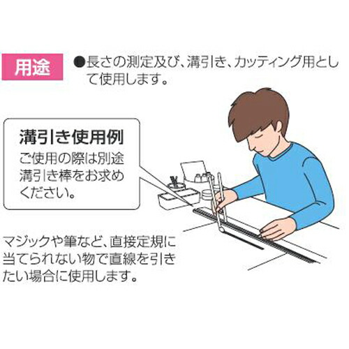 | 長さの測定・線引き・カッティング定規・溝引き用。大きく鮮明な目盛数字を採用しています。危険防止壁でカッターの刃が滑って乗り越える事がないです。マジックや筆等、直接定規に当てられない物で直線を引きたい場合に溝引きを使用します。スベリ止め付は裏面にスポンジが貼りつけてあり、軽い力で定規をおさえられます。 |