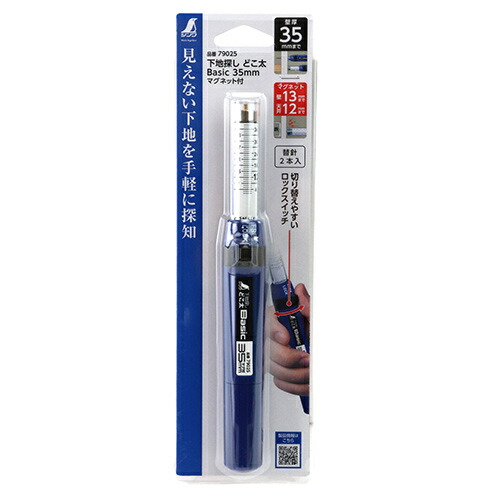 | 石膏ボード用の針式の下地探し。ボード裏の木製下地を針で刺して探知します。目盛付で刺し込んだ壁のおおよその厚さが分かります。片手で簡単にロックの切り替えができるので、スムーズに作業が行えます。本体内部に替針が2本入っています。針は壁厚35mmまで、マグネットは壁厚13mm、天井厚12mmまで使えます。 |