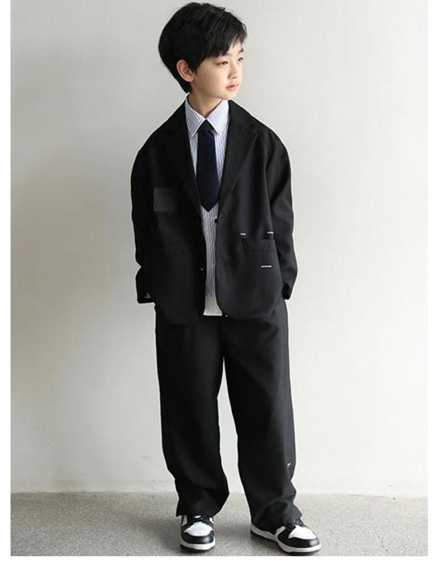小学生 大きいサイズ ジャケット 子供服 スーツ 卒園式 卒業式 4点セット ジュニア 男の子 セットアップ 4点セット スーツ 長袖 スーツ ゆったり 入学式 ロングパンツ シャツ ネクタイ 4点セット 子供服 春 秋 おしゃれ 無地 発表会 結婚式 ブラック
