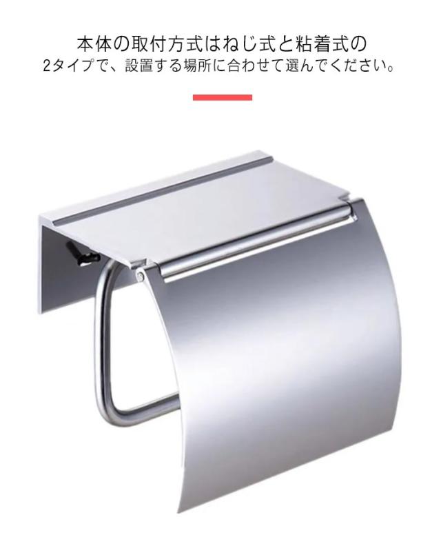 | スタイリッシュでモダンな印象を与えるアルミ合金製トイレットペーパーホルダー。 ペーパーの交換も横から差し込むだけの簡単設計。 ホルダーの上が収納スペースに。掃除用具の収納やスマートフォンの一時置きなどに使えます。 び割れや錆が発生しにくい粉体塗装。耐久性・撥水性が高く、お手入れしやすいのもうれしいポイントです。 本体の取付方式はねじ式と粘着式の2タイプで、設置する場所に合わせて選んでください。 | |