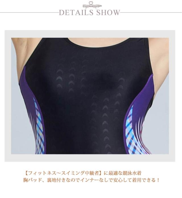 | 【フィットネス〜スイミング中級者】に最適な競泳水着 胸パッド、裏地付きなのでインナーなしで安心して着用できる! クローズドバックで露出を抑えつつ、肩甲骨をはオープンなので肩の動きを妨げず動きやい。 ワンピースタイプなのでめくれる心配もなく、運動に集中できます。 セパレートのフィットネス水着より動きやすく、 競泳水着より露出が少なく着用しやすいのでフィットネスでの使用やこれからスイミングを始める方にオススメです。 落ち着いた色合いで幅広い年齢層にお使いいただけます! | |