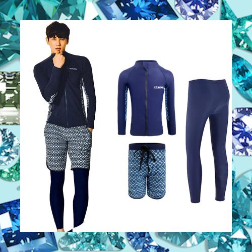 Men’s 3-piece swimsuit set: Rash guard, surf pants, leggings. This swimsuit set is made with highly elastic fabric for fitness activities. The front zip up makes it easy to change and protect your skin. Anti-bacterial and odor-resistant, UV protection. The long sleeve rash guard has simple leggings that are made up to the ankle, so it can also be used to protect against insect bites, jellyfish and other injuries. Great for a variety of occasions such as the beach, the gym, and surfing.