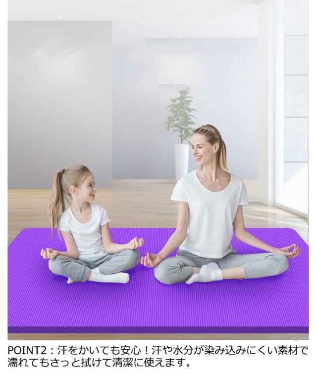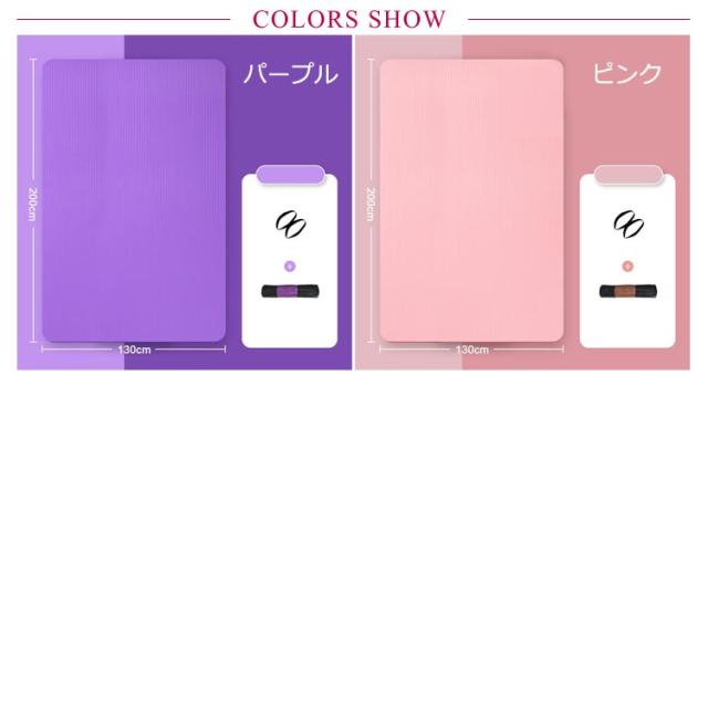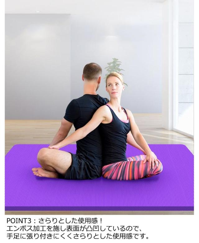 | 200*130cm!特大サイズの2人用ワイドヨガマット。 POINT1:厚さ15mmでクッション性もばっちり!優しい弾力のNBRを採用!クッション性が高くひざやひじをついても痛くなりにくく快適にトレーニングが行えます。 POINT2:汗をかいても安心!汗や水分が染み込みにくい素材で濡れてもさっと拭けて清潔に使えます。 POINT3:さらりとした使用感!エンボス加工を施し表面が凸凹しているので、手足に張り付きにくくさらりとした使用感です。 寝転んでも使えるゆったりサイズ!約200cm×130cmの特大サイズなので様々なヨガのポーズや寝転がってのトレーニングにも対応! 床の保護や騒音軽減も◎!トレーニングマシンの下にひけば床の傷つきの防止にも使える。また厚みのあるマットによって騒音を軽減してくれます。 持ち運びに便利なゴムバンド付き!ゴムバンドがセットなのでヨガ教室にも持ち運び楽々!また軽量なので手軽に持ち出せます。 | |