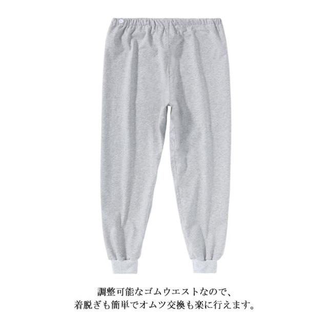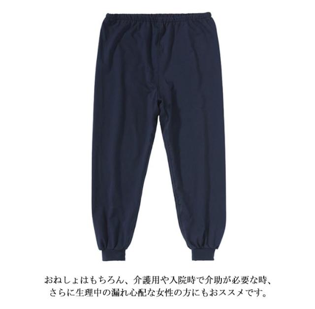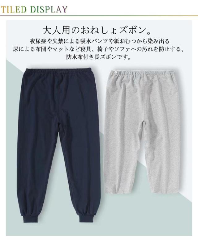 | 大人用のおねしょズボン。【ロング丈/六分丈】 夜尿症や失禁による吸水パンツや紙おむつから染み出る尿による布団やマットなど寝具、椅子やソファへの汚れを防止する、防水布付き長ズボンです。大人用のおねしょズボン。 おねしょはもちろん、介護用や入院時で介助が必要な時、さらに生理中の漏れ心配な女性の方にもおススメです。 3層保護で漏れにくい!外側に肌さわりのいい綿100%、中層にTPU防水フィルムが内蔵、直接肌に触るの側には柔らかくもふもふ触感の生地を採用します。安心しておやすみいただけます。 調整可能なゴムウエストなので、着脱ぎも簡単でオムツ交換も楽に行えます。 ウエストの部分には、リング付きゴム・ドローコード仕様でしっかりフィットします。体型問わず、心地よく利用できます! | |